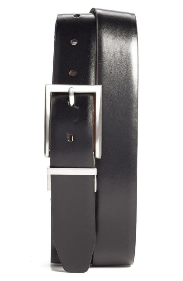 A brushed-metal buckle fronts a sharp belt featuring reversible functionality for maximum versatility.