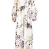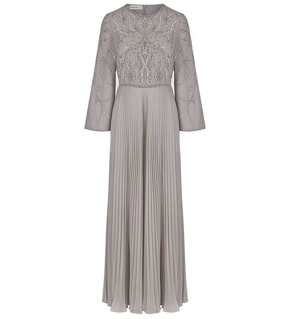 Iridescent floral embroidery adorned with beads and sequins embody artistic detail in the bodice of this evening dress. Flute kimono sleeves, a sunburst pleated full skirt, and a metallic-matte getup play in harmony.